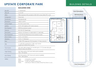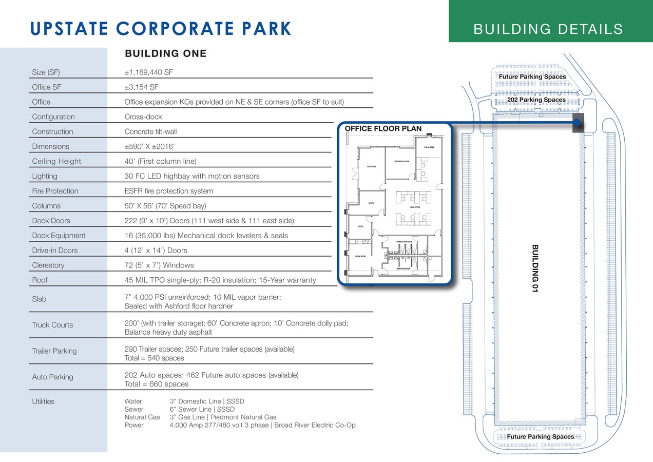 Upstate Corporate Park is a fully entitled industrial park with existing road and park infrastructure in place. It offers unrivaled access (1 mile) to I-85, the explosive growth corridor of the Upstate of South Carolina connecting the greater southeastern market. The Upstate Corporate Park Building 1, a ±1,189,440 SF distribution center, has been thoughtfully designed to deliver a highly functional and well positioned supply chain solution with close proximity to an exploding population, and access to multiple logistical outlets. ±1,189,440 SF Class A Industrial Building Q1 2024 Delivery Dimensions: 590’ x 2,018’ Construction: Concrete Tilt Up Walls Slab: 7” (4,000 PSI) Unreinforced / 10 mil Vapor Barrier Roof: TPO (45 mil Single Ply) / R-20 Insulation / 15-year Warranty Sprinklers: ESFR Power: 4,000 Amp 277/480 volt 3-Phase Lights: LED to suit Windows: 72 (5’x7’) Clerestory Configuration: Cross-dock Ceiling Height: 40’ (at First Column Line) Column Spacing: 50’ x 56’ / 70’ Speed Bay Dock Doors: 222 (9’x10’) / 111 on East Side / 111 on West Side Drive-in Doors: 4 (12’x14’) Truck Courts: 200’ with Trailer Storage / 60’ Concrete Apron / 10’ Concrete Dolly Pad Trailer Parking: 540 Total Spaces (290 Trailer Spaces & 250 Future Trailer Spaces) Auto Parking: 660 Total Spaces (202 Auto Spaces & 462 Future Auto Spaces) All Utilities Available Location: Upstate Corporate Park is strategically located on SC-110 just north of Interstate 85 in Spartanburg County, Building 1 is ±1.2 miles from I85 (Exit 83), ±11 miles from Spartanburg, ±14 miles from I26, ±25 miles from BMW, ±30 miles from GSP International Airport & the SC Inland Port-Greer, ±39 miles from Greenville & I385, ±70 miles from Charlotte, NC and ±180 miles from Atlanta, GA.