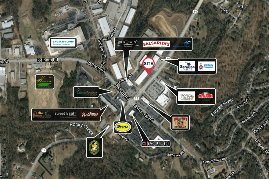 Free standing brick office building 3 Private offices with kitchen Flexible floorplan Excellent location (near the intersection of Pelham Road and Hwy 14 with quick access to I-85) Close proximity to many amenities, Greenville Spartanburg (GSP) Airport (±3 miles), and I-385 (±5 miles) Zoned I-1, Greenville County GSP Airport Environs – Special Land Use Area